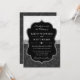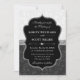 This sophisticated wedding design features a graceful blend of black, white, and silver tones with floral motifs and ornamental detailing. A silver ribbon with a diamond-like embellishment separates the top and bottom floral sections, framing a central black panel with refined white typography. Perfect for formal weddings, black-tie events, or upscale stationery, this layout evokes timeless elegance with a touch of sparkle and romantic charm.