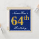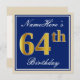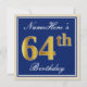 Ces caractéristiques de conception simples et élégantes d'invitation de fête d'anniversaire un message personnalisé comme "le soixante-quatrième anniversaire de NameHere" (avec le "soixante-quatrième" ayant un faux/imitation or-comme le regard de coloration) dans un secteur carré bleu-coloré comportant un contour simple. Le nom dans un élégant blanc-est coloré manuscrit-comme le texte, et peut être personnalisé. Les caractéristiques arrières ont personnalisé des détails d'invitation. Une invitation de fête d'anniversaire comme ceci pourrait peut-être être employée en invitant des personnes à une fête d'anniversaire étant tenue pour quelqu'un qui célèbre leur soixante quatrièmes anniversaires. [~Z0000228]