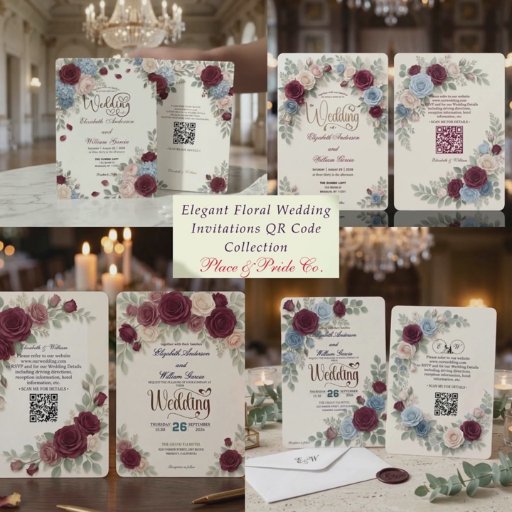 Annoncez votre cérémonie de jardin romantique avec cette suite botanique sophistiquée, mettant en vedette une palette raffinée de bleu poussiéreux, de rose saumon et de roses bordeaux. Ce design présente un fond crème doux encadré par une bordure arquée de roses bleu poussiéreux, rouge bordeaux et rose saumon mélangées à un feuillage d'eucalyptus vert sauge. La composition utilise une hiérarchie typographique formelle, associant une écriture calligraphique élégante pour les noms à une police serif classique pour les détails de l'événement. Un élément technique carré scannable est incorporé de manière transparente dans la mise en page traditionnelle sans perturber le flux visuel. Il s'agit d'une image imprimée plate avec un effet de peinture à l'aquarelle imprimé, et non d'un matériau en relief réel ou d'une texture peinte à la main.