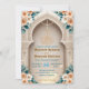 Set a sophisticated tone for your Nikkah ceremony or Walima reception with this elegant architectural design. The layout features soft peach roses and sage green leaves framing a printed faux gold Bismillah script against a cream background. Easy to customize with your specific venue details and dates.