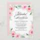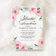 Ces élégantes invitations à déjeuner nuptiale de mariage présentent un cadre fleuri de fleurs marguerites d'aquarelle dans des tons doux de rose, de rougeur, d'aqua et de vert. Texte d'invitation noir classique avec accents de script. Un motif à pois suisse blanc apparaît sur le côté fond rose ballet léger de la carte. Idéal pour un événement de douche nuptiale de printemps ou d'été.