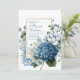 Invite your guests with breathtaking elegance using this sophisticated floral wedding invitation. The design showcases a stunning, painterly watercolor bouquet arranged gracefully along the bottom and left side against a clean white background. A magnificent dusty blue hydrangea cluster provides a lush focal point, beautifully complemented by large, soft white and blue-tinged flowers, reminiscent of peonies. This exquisite arrangement is artfully interwoven with delicate beige and white filler flowers and sprays of dusty sage-green eucalyptus leaves, creating a fresh, romantic, and sophisticated feel. A minimalist, thin gold rectangular frame provides a perfect, modern space for your event details. Perfect for sophisticated weddings (especially with a 'something blue' theme), this design is also ideal for elegant bridal showers, milestone birthday celebrations, anniversary parties, baby showers, or upscale garden events. This versatile design can also be adapted for sophisticated corporate galas, charity fundraisers, or elegant announcements requiring a touch of refined floral beauty.