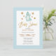 Célébrez l'arrivée prochaine de votre précieux bébé avec cette adorable et mignonne "Invitation de Baby shower" avec un dinosaure bleu brandissant bonjour sous les étoiles au sommet. Le titre présente une feuille d'or comme la calligraphie. L'arrière - plan est doté d'un motif aux flèches bleu pastel. Tous les textes sont pré-arrangés pour que vous personnalisiez facilement et rapidement avec vos détails baby showers.