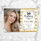Elégante invitation au 50e anniversaire fleurie féminine avec votre photo. Design blanc de verre avec parties scintillant d'or. Comprend des rayures, des roses blanches, des caractères de script et des confettis. Parfait pour une fête anniversaire adulte élégante. Personnalisez avec vos propres détails. Peut être customisé pour n'importe quel âge ! Invitations Zazzle imprimées ou téléchargement instantané modèle imprimable numérique.