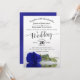 Cette magnifique faire-part de mariage présente un design floral moderne avec un seul rose bleu royal à long tige ou couleur cobalt allongé sur son côté, se reflétant dans un bassin avec vagues et ondulations. Le design est simple, élégant, romantique et sophistiqué, avec la calligraphie de script en dentelle et le contenu entièrement personnalisable.