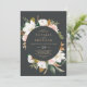 Cette élégante faire-part de mariage décontractée en noir et blanc de magnolia est parfaite pour une mariage moderne et classe. Le design floral moody est composé de pivoines roses d'aquarelle, de magnifiques fleurs de magnolia blanches et de coton avec de l'or et des feuilles verts dans un agencement luxueux sur un arrière - plan sombre.