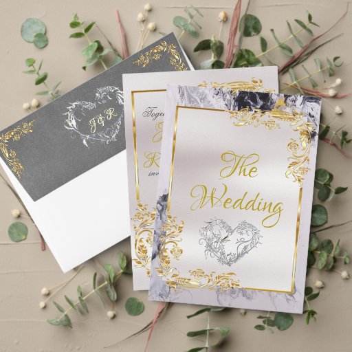 Invitation Elegant Marble, White, Gold Frame, Silver Heart