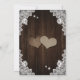 Elégant faire-part de mariage rustique violet et bleu fleuri avec deux coeurs fleuris sur un arrière - plan en bois de grange décoré de dentelle blanche fleurie. Éléments correspondants disponibles.