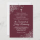 Cette belle faire-part de mariage est parfaite pour une cérémonie catholique moderne. Il présente un design magnifique avec des lettrages élégants et orné gris argent boucles et tourbillons dans les coins sur un arrière - plan bordeaux, marron, ou vin rouge. Inclut une croix ou un crucifix, et une formulation invitant vos invités à assister à une messe nuptiale unissant le couple dans le sacrement du mariage saint. Cet invitation est la combinaison parfaite de la tradition formelle et du style moderne, ce qui en fait une merveilleuse façon d'invitation vos amis et votre famille pour partager votre joie dans votre journée spéciale.