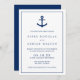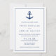 Invitations de mariage nautique avec un design simple et moderne avec une ancre bleu marine et les détails de votre événement à l'intérieur d'une frontière, sur un arrière - plan blanc. Ces élégants invitations sont parfaits pour un mariage d'été à thème côtier au bord de la plage.