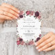 Cet élégant faire-part de mariage fleuri d'été bordeaux est parfait pour un mariage moderne. Le design présente de beaux roses bordeaux bordeaux bordeaux dessinés à la main, soigneusement arrangés en cadres et bouquets attrayants.