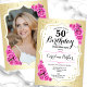 Elégante invitation à 50e anniversaire fleurie avec votre photo au verso de la carte. Design de glam avec faux or. Comprend des roses roses roses, des caractères de script et des confettis. Parfait pour une fête anniversaire adulte élégante. Personnalisez avec vos propres détails. Peut être customisé pour n'importe quel âge ! Invitations Zazzle imprimées ou téléchargement instantané modèle imprimable numérique.
