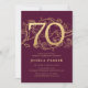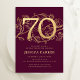 Elégante invitation à la fête du 70e anniversaire de marron bordeaux or 70e. Design de vin marsala rouge foncé personnalisable avec accents botaniques rose et police de caractères typographiques. Carte invitation florale simple parfaite pour une célébration anniversaire élégante. Personnalisez avec vos propres détails. Invitations Zazzle imprimées ou téléchargement instantané modèle imprimable numérique.