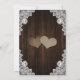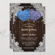 Rustic purple and blue wedding invitation featuring two heart-shaped hydrangea flowers on a barn wood background adorned with white floral lace and string lights. Elegant and romantic wedding invite perfect for your purple and blue rustic wedding party.