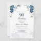 Élégant Script floral 90th Birthday Celebration Invitation vous pouvez facilement customiser avec les détails de votre fête en cliquant sur le bouton "Personnaliser". Doté d'un bleu poussiéreux floral et de verdure avec typographie moderne.