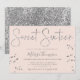 Un script de parties scintillant argenté chic, moderne et élégant typographie Sweet sixteen invitation anniversaire avec parties scintillant scintillante confetti sur éditable pastel rose roux et un arrière - plan argent glittery à l'arrière. Un sweet sixteen luxueux et élégant.