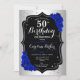 Elégante invitation à 50e anniversaire fleurie avec votre photo au verso de la carte. Design de glam avec faux argent. Comprend des roses bleus royaux, des caractères de script et des confettis. Parfait pour une fête anniversaire adulte élégante. Personnalisez avec vos propres détails. Peut être customisé pour n'importe quel âge ! Invitations Zazzle imprimées ou téléchargement instantané modèle imprimable numérique.