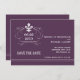 Annoncez vos plans de mariage à vos amis et à votre famille avec ces cartes Élégant Style Rétro Fleur de Lis Save the Date. La carte présente un design élégant avec le symbole Fleur de Lis et de la place pour ajouter votre date de mariage. La carte indique "save the date" dans une impression blanche de style rétro. Personnalisez avec vos noms et date de mariage. Présenté ici sur un fond violet aubergine.
