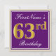 Cette conception simple et élégante de carton d'invitation pour une fête d'anniversaire comporte un message personnalisé comme « 63e anniversaire de FirstName » (avec le « 63e » ayant une apparence dorée fausse/imitée) dans une zone carrée de couleur violette avec un simple contour de bordure. Le nom est dans un texte élégant de couleur blanche de type script, et peut être personnalisé. Le verso comporte les détails personnalisés de l'invitation. Un carton d'invitation pour une fête d'anniversaire comme celui-ci pourrait peut-être être utilisé pour inviter des gens à une fête d'anniversaire organisée pour quelqu'un qui célèbre son soixante-troisième anniversaire.