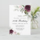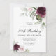 Célébrez un anniversaire spécial de 100e anniversaire avec cette belle invitation de fête avec des bordures florales en roses bordeaux et roses de chaque côté du texte placé élégamment. Les couleurs comprennent le rose pâle, le rouge bordeaux profond et le prune mélangés à la verdure éthérée et de minuscules fleurs blanches d'accent. Personnalisez le modèle de texte avec vos informations. Vous pouvez modifier l'âge à n'importe quel âge anniversaire.
