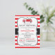 Joli, élégant camion feu rouge thème baby shower invitation sur rayures rouge et blanc brillant motif avec aspect formel vintage. Idéal pour les camions de pompiers, les baby showers à thème pompier. Invitation de forme de support rétroactive. Invitation neutre pour garçon ou fille.