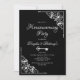 Une élégante invitation à la fête de la maison en noir et blanc avec des coins diagonaux en dentelle ornée pour encadrer le texte blanc.