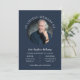 Service commémoratif minimaliste ou invitation funéraire avec une photo de votre être aimé dans un cadre rond. Invitation funéraire bleu marine avec une photo ronde de votre être aimé et le libellé de l'invitation dans un design propre. Elégante invitation de service commémoratif personnalisée avec une photo et In Loving Memory Of en texte courbe autour de la photo. Elégante invitation funéraire pour les hommes.
