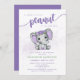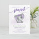 Petite fille Baby shower Eléphant Violet Petite arachide Invitation avec un mignon éléphant violet assis. L'arachide de calligraphie de script est en route pour la conception.