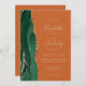 Le bord gauche de cette élégante faire-part de mariage moderne est orné d'une bordure en aquarelle vert émeraude, recouverte d'une parties scintillant en faux or. Le texte personnalisable combine écriture manuscrite dorée, cuivre et polices italiques sur un arrière - plan orange brûlé ou rouille. L'envers offre de l'espace pour les détails mariages sur un arrière - plan orange brûlé solide, ainsi qu'un code QR que les invités peuvent scanner pour visiter votre site Web et RSVP, qui économise le coût d'impression et d'envoi de cartes RSVP séparées.