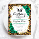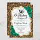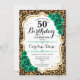 Invitation à la fête du 50e anniversaire. Design vert émeraude floral élégant avec de l'or parties scintillant et des roses. Caractéristiques du poster de animal de guépard léopard et police de script. Idéal pour une célébration anniversaire féminine élégante. Peut être customisé pour n'importe quel âge ! Invitations Zazzle imprimées ou téléchargement instantané modèle imprimable numérique.