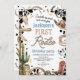 Rustic Cow-print Western First Rodeo 1st Birthday Invitation d'anniversaire de premier rodéo invitation pour un bébé avec un titre de corde, botte de cowboy, corde, casquette de cowboy, cactus, baril et plus. Cette selle sauvage d'ouest se lève et surfe sur la 1ère invitation d'anniversaire de rodéo est idéale pour un rodéo ou une fête occidentale de premier anniversaire.