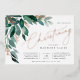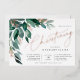 Élégante invitation au baptême ou au baptême pour votre petite fille présente des feuilles d'eucalyptus aquarelle et des feuillages verts en cascade du coin supérieur gauche, agrémentés d'accents roses en feuille d'or. Personnalisez avec vos détails de cérémonie de baptême et de célébration alignés à droite. Cartes inversées à vert de forêt solide.