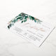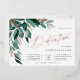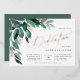 Élégante invitation à la dédicace pour bébé pour votre petite fille dispose d'aquarelle feuilles d'eucalyptus et de feuillage vert en cascade du coin supérieur gauche, agrémenté d'accents roses de feuille d'or. Personnalisez avec votre cérémonie de dédicace et les détails de la célébration alignés à droite. Cartes inversées à vert de forêt solide.