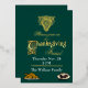 Elégante invitation à un dîner Thanksgiving en or et vert avec des photos de raisins, dinde et tourte. Vos informations au verso.