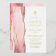 Le bord gauche de cette élégante invitation à la première communion moderne comporte une bordure d'aquarelle rose vif, ornée d'une fausse parties scintillant dorée. Une petite croix apparaît au-dessus du texte personnalisable, qui combine écriture manuscrite, copperplate et italique en véritable feuille d'or sur un arrière - plan blanc. L'envers est assorti d'un design d'agate en blush et or. Idéal pour la première communion d'une fille.