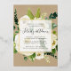 Élégante et moderne invitation à la fête de fiançailles florales présente un arrière - plan de roses d'ivoire et de pivoines avec des plantes vertes luxuriantes et du feuillage avec de véritables garnitures de feuille d'or. Les détails de votre fiançailles sont superposés sur un élément blanc pur dans un élégant lettrage noir foncé accentué de calligraphie de style manuscrit. Un arrière - plan kraft brun moucheté ajoute un charme rustique.