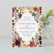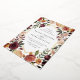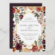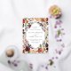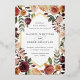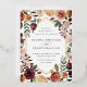 Piège à somptueux tons de terre, cet élégant faire-part de mariage floral ou les mariages d'automne ou d'hiver présente vos détails nichés à l'intérieur d'un hexagone allongé en feuille d'or entouré de roses d'aquarelle, de mamans et de verdure dans des couleurs d'automne rustiques, comme la pêche, l'ivoire, le rougissement, le bordeaux et le vert.