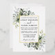 Le Faire-part de mariage moderne Elegant Greenery comprend une végétation botanique, des feuilles d'eucalyptus et des feuilles bleus poussiéreux. Cadre à huile d'or. Sage Green Back.