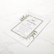 Elégante invitation à l'anniversaire de verdure botanique avec un feuillage d'aquarelle et un éclair de feuille d'or. Couleurs dans le bleu poussiéreux et beige tan.