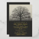 Invitation de service commémoratif aux couleurs muettes avec la silhouette d'un arbre contre le ciel, la brume recouvrant le sol, et les polices de feuille d'or.