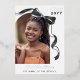 Jolie invitation à la remise des diplômes et faire-part en un personnalisé avec une photo en arc ornée d'un joli ruban avec un arc en papier noir et argent. Invitation de graduation double face avec un arrière - plan blanc et de jolies arcs noirs. Fille 2 en 1 faire-part de graduation et invitation personnalisée avec photo et le nom du diplômé dans une belle écriture en feuille d'argent et sa photo décorée avec un arc en feuille de noir et d'argent.