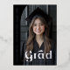 Élégant faire-part de graduation noir avec votre photo dans un cadre demi-arc avec du texte en papier d'aluminium superposé "grad" dans un avant de style rétro. Aligné verticalement à gauche est le nom et l'école du diplômé, aussi en vrai feuille. Message personnalisé et photo supplémentaire au dos. Le texte à l'arrière est blanc.