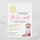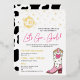 Invitation à la soirée bachelorette à thème Cowgirl en papier rose, blanc et or avec une boule disco dorée entourée d'étoiles dorées. Allons la fille en rose-chaud. Une mignonne cowgirl botte en rose et or avec les coeurs et les étoiles. Le dos est orné d'un motif de vache noir et blanc.