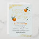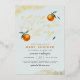 Bleu Chic Une Petite Cutie Baby shower Orange Foil Invitation. Une petite mignonne est en route ! Célébrez la future maman avec ce design avec cette phrase en lettres de script élégantes, avec des oranges peintes à la main et des feuilles verts contre un arrière - plan bleu pastel. Vos détails de douche apparaissent ci-dessous dans la typographie moderne. Il y a une fausse parties scintillant d'or dans les coins supérieur gauche et inférieur droit.