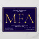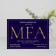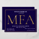 Une invitation à la fête de remise de diplômes du MFA avec feuille d'or, texte blanc, et un arrière - plan bleu. Ajoutez simplement vos informations, ajoutez cette invitation à votre panier et célébrez cette réalisation majeure. Blue Gold MFA Graduation Foil Invitation Conception de jour férié | ©Melissa Patton - Designer