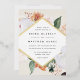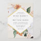 Un élégant faire-part de mariage floral présente vos détails mariages en lettrage moderne, dans un cadre géométrique en losange de fleurs pastel aquarelle et feuillage botanique dans des tons de terre inspirés du désert de pêche, vert sauge, blanc et ivoire. La garniture en feuille d'or complète la recherche d'une touche luxueuse.