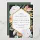 L'élégante invitation à la fête de fiançailles florales présente un cadre hexagonal allongé de fleurs d'aquarelle et de feuillage dans des teintes de pêche inspirées du désert de saumons, de blanc, d'ivoire et de vert de sauge, et fini avec des garnitures en feuille d'or. Personnalisez avec les détails de votre fiançailles en lettres modernes.