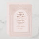Un design unique avec de multiples lignes d'arc délicates entourant vos informations faire-part de mariage en feuille d'or rose estampillée, sur un rose pâle / doux avec tout le texte en terre cuite. Au verso, ajoutez les détails de votre mariage et les informations rsvp.