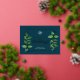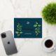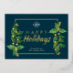 Classy moderne horizontale heureux vacances entreprises à la fois d'imprimer latéralement carte de voeux plat avec un endroit pour votre logo avec des feuilles de noël aquarelle classique et vrai doré cadre pressé et heureux texte de vacances sur un élégant turquoise foncé arrière - plan. Carte de voeux de Noël parfaite pour les entreprises, les petites entreprises, les entreprises à domicile, les employés, les entreprises de vacances ou toute organisation, le design moderne donnera à vos clients l'impression de luxe et de succès. Le côté arrière a un libellé personnalisé. Ce modèle de carte Happy Holidays est prêt pour votre personnalisation en ligne. La feuille d'or peut être changée en or ou argent rose. Ce magnifique crédit photo va à : Libby Penner