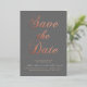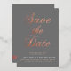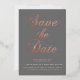 Elégante et élégante invitation à la calligraphie simple avec torsion d'or rose. Mise en page moderne avec script personnalisé "enregistrer la date" en or rose avec police moderne pour toutes les informations et bordure rose or en bas sur un arrière - plan gris